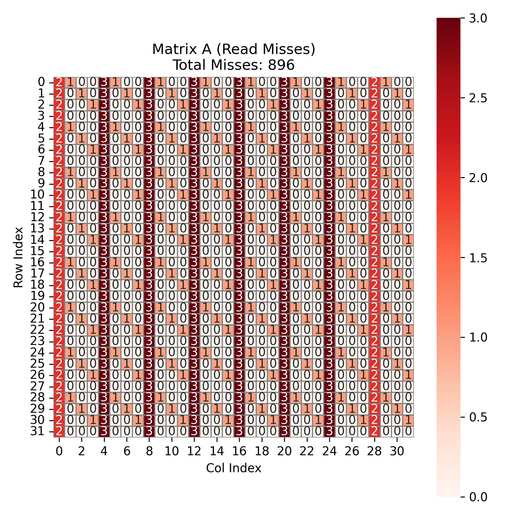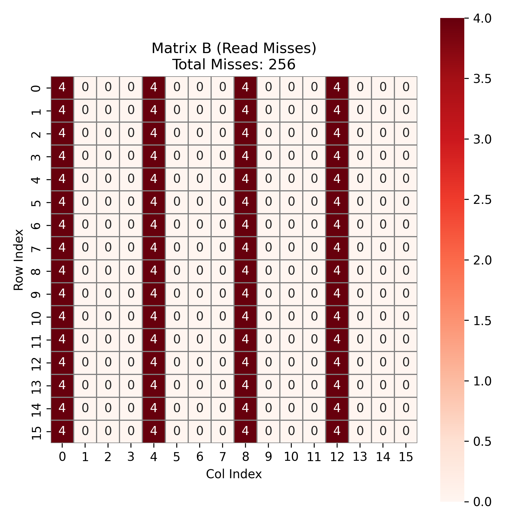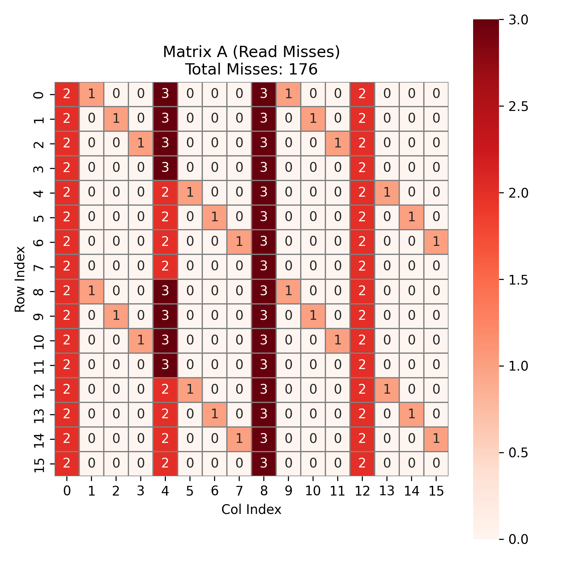 block_j=0及其对角线衍生位置),\(B\) 的读取覆盖了 \(A\) 所在的set 0, 4...,导致 \(A\) 被踢出。当下一个块需要 \(A\) 时,必须重新读取,于是产生了miss。在余下的12个本该复用的块中,有7个块被 \(B\) 驱逐,只有5个块实现了复用。固有 \(7\) 个冲突块 \(\times\) \(16\) 次读取 = \(112\) 次miss。A 的总cache miss为:\(64 + 112 = 176\) 次cache miss。如图所示: