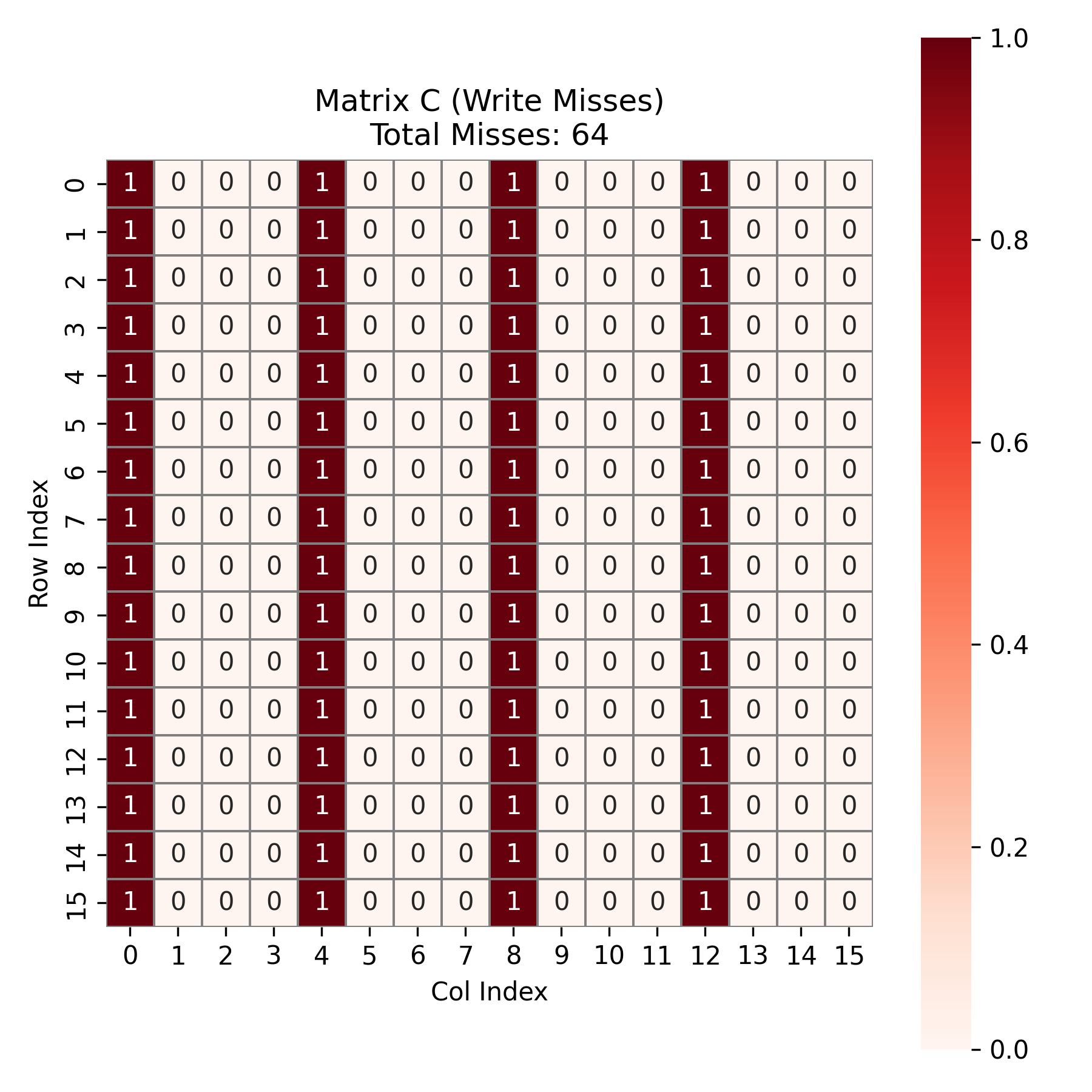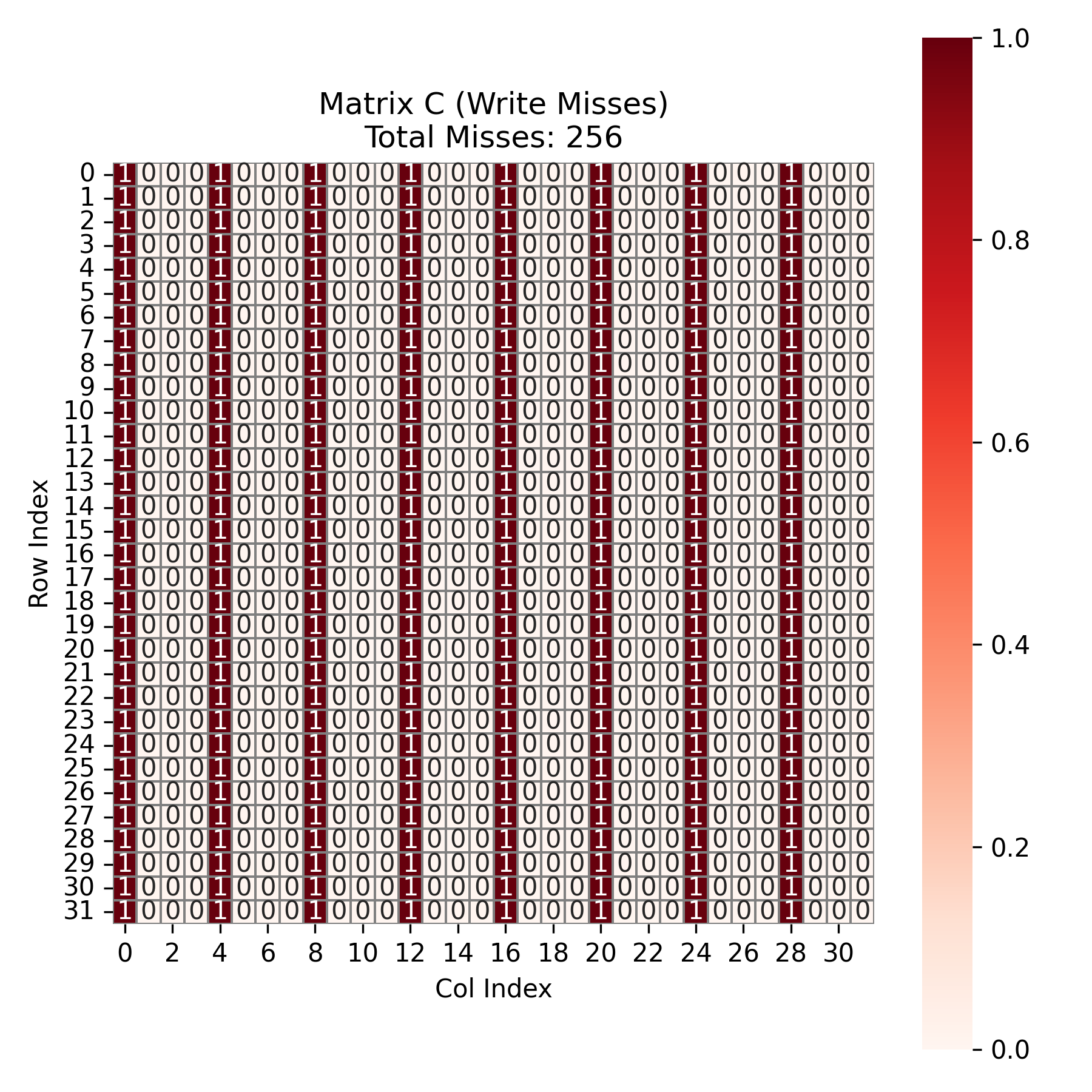 对于矩阵 \(C\) ,由于 \(C\) 的大小为 \(32 \times 32 = 1024\) ,故 miss 次数为 \(1024 \div 4 = 256\) 次。如图所示: