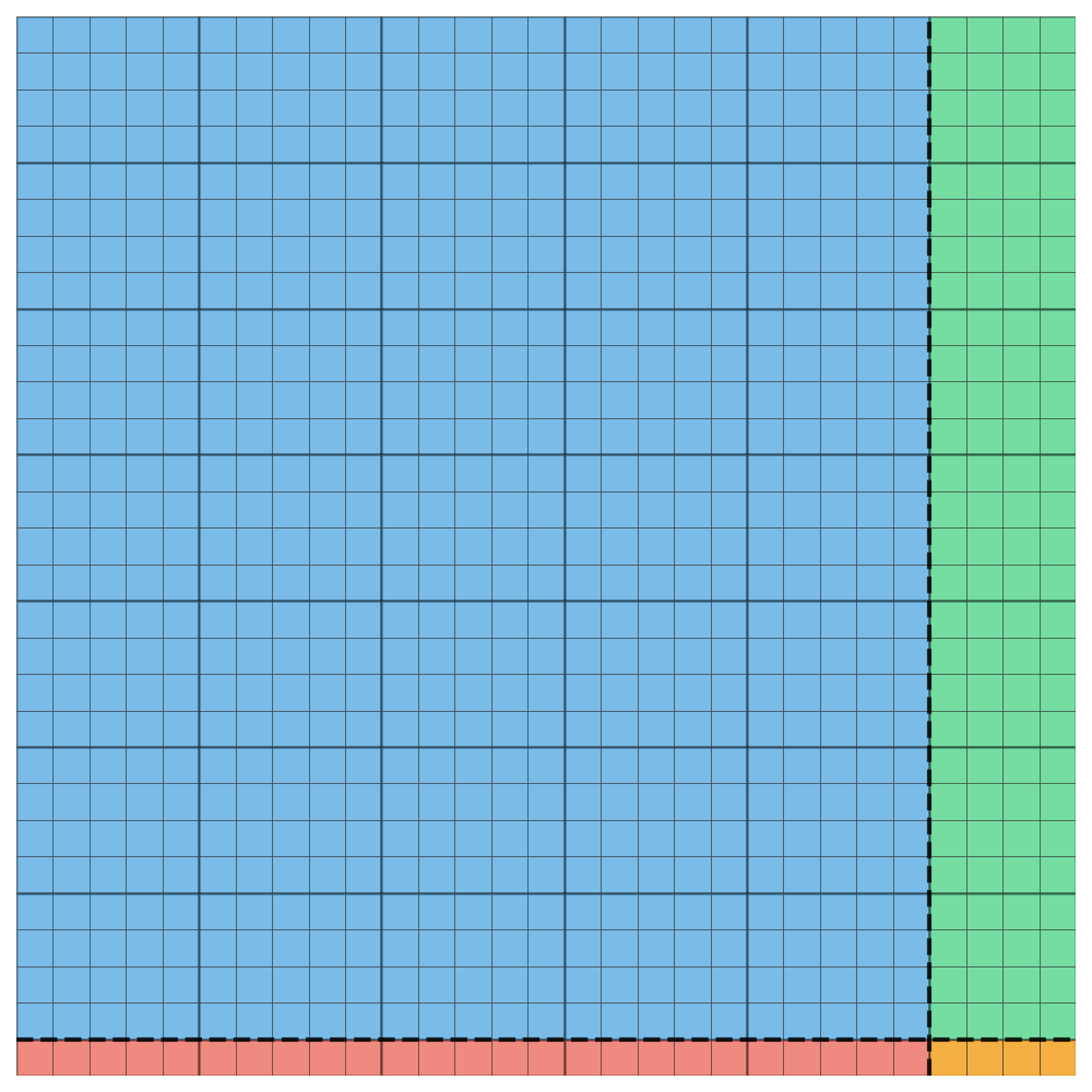主体块区域:\(28 \times 25\) (行 0~27,列 0~24),使用 \(4 \times 5\) 分块完全覆盖。