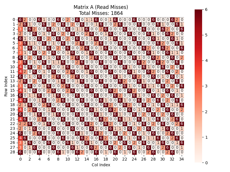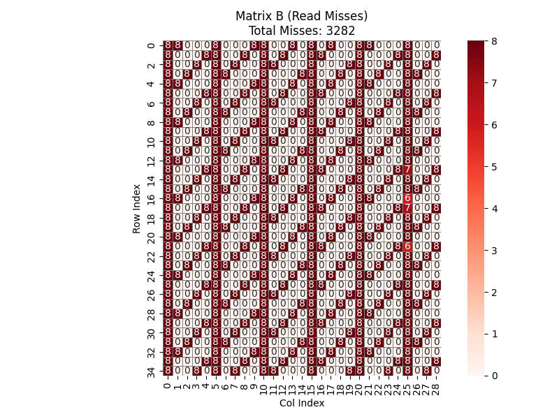 接下来是矩阵 \(B\)。外层循环 BI 步长为 4,处理矩阵需迭代 7 轮主循环(加上边缘处理共计约 8 轮扫描)。同时,每一轮扫描都会将前一轮的数据彻底替换。读取分块中的 5 个连续元素时,第一个元素占据了当前 line 的末尾,导致后续 4 个元素必须从下一个 line 中获取。由于 \(B\) 是按列块扫描,地址跳跃大,cache 无法同时驻留两个 line,导致原本 1 次加载能完成的任务变成了 2 次 miss。如图,最终的 miss 为 3282 次。