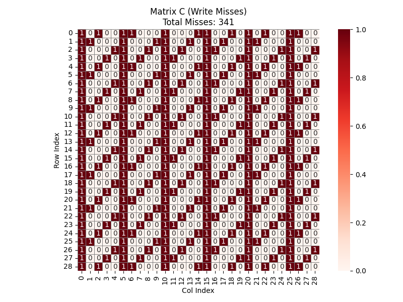 先分析矩阵 \(C\) 。我们知道一个 cache line 可以存储 4 个 int ,而矩阵行、列并非 4 的倍数,所以 \(C\) 的首地址并不是在一个 cache line 的 0 号位。计算后知道 \(C\) 的首地址应该在 line 的 3 号位。同时,由于 \(N=29\),每一行的起始地址相对于 cache line 的偏移量都会发生变化。由 \(29 \mod 4 = 1\) ,我们知道每一行的起始位置都会比上一行右移一格。主循环中一次写入 5 个元素,占据 20 bytes。所以无论起始位置在哪,写入五个元素必然会跨越两个 cache line 。这意味着处理每一个 block 时,写入 \(C\) 的一行往往需要触发 2 次 miss,而不是理想情况下的 1 次。如图, \(C\) 的 cache_miss 为 341 次。